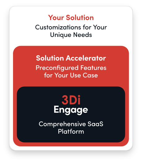 Accelerators are a preconfigured set of features on the 3Di Engage platform. They’re designed to quickly empower a specific type of use case, while leaving room for our team to customize your solution for the unique needs of your organization. Similar to custom software, your solution will feel like it was designed specifically for you. But unlike custom software, it can be deployed in a matter of weeks at a reasonable cost and is backed with a proven SaaS platform that’s highly secure, easily extensible, and simple to maintain and update.