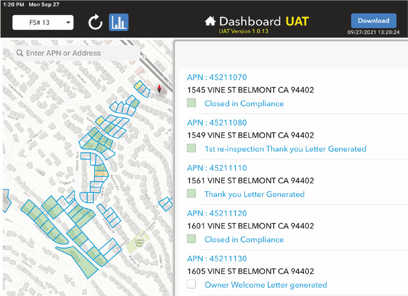 - More efficient field inspections. Inspectors can quickly document high-risk parcels in non-compliance on mobile devices. They simply drag and drop WUI violation icons onto the satellite view of the parcel to automatically generate notices, statistics, and reports—streamlining the inspection process to maximize the agency’s limited resources.